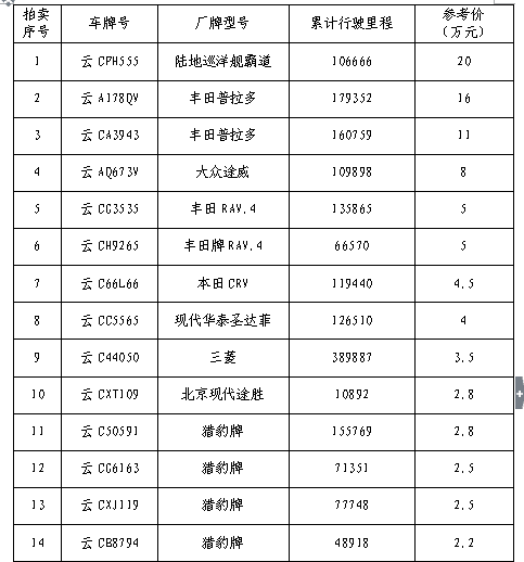 經(jīng)鎮(zhèn)雄縣人民政府批準,受鎮(zhèn)雄縣國有資產(chǎn)管理局委托,公開拍賣鎮(zhèn)雄縣公車20輛。以輛為單位拍賣。相關(guān)事項如下: