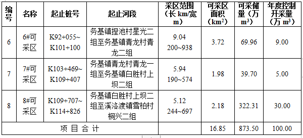 (二)規(guī)劃河段可采區(qū)劃定及基本情況表: